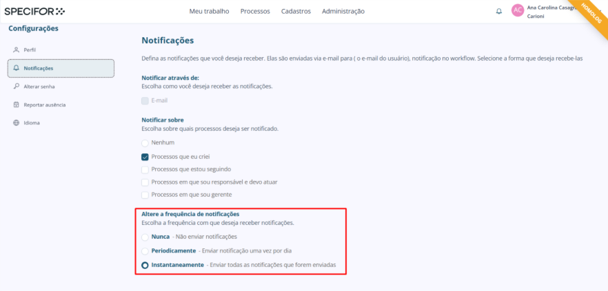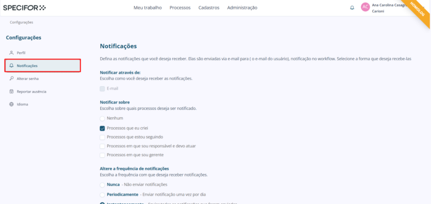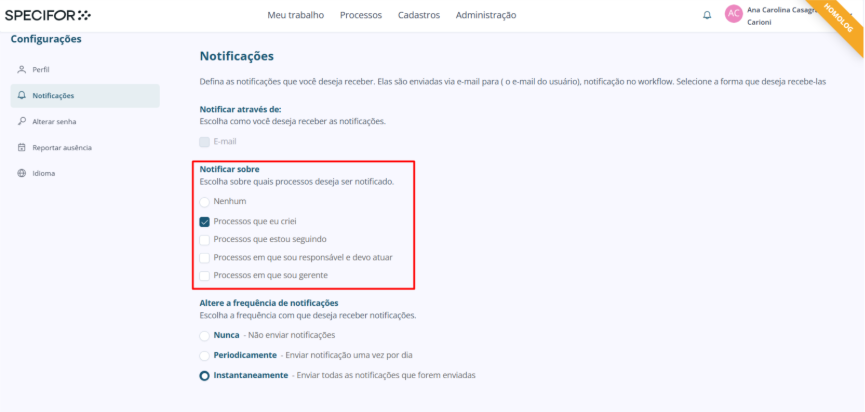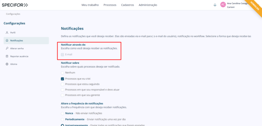 Este artigo auxilia o usuário na configuração das preferências de notificação no Specifor SaaS, para escolher como e quando deseja receber alertas sobre os processos.