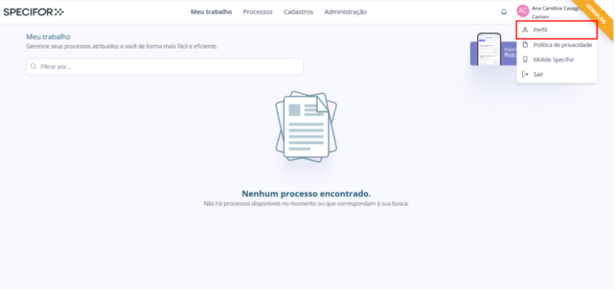 Na página inicial do Specifor, clique no nome do perfil, localizado no canto superior direito da tela, e depois selecione "Perfil".