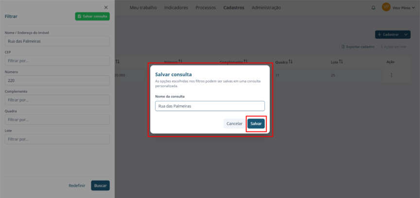 Se desejar, você poderá salvar os filtros utilizados em uma consulta. Para isso, clique em “Salvar consulta”, localizado no início da aba “Filtrar”.