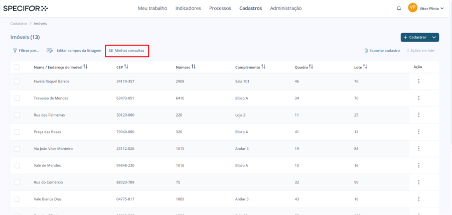 Para reutilizar a consulta salva, clique em “Minhas consultas”, na página inicial do cadastro.