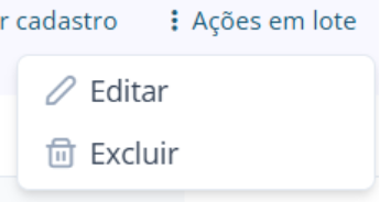 Ao finalizar a seleção, clique no botão “Ações em lote”, localizado no canto direito da tela, acima da listagem de cadastros. Um menu suspenso com as possíveis ações em lote será exibido.