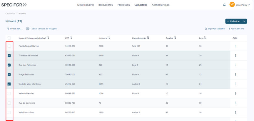Na página de um cadastro, selecione os cadastros que participarão das ações em lote. Para isso, utilize os seletores posicionados na coluna esquerda, à lateral dos cadastros. É possível selecionar quantos cadastros desejar.