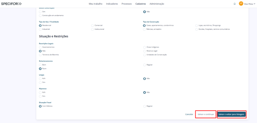 Ao finalizar a consulta e/ou alterações no cadastro, role até o final da página e clique em “Salvar e continuar” caso deseje permanecer na página do cadastro.