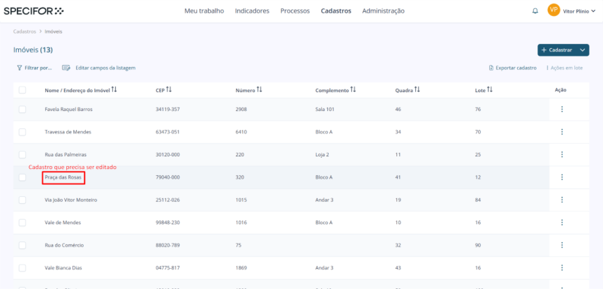 Em seguida, clique no nome do cadastro que deseja editar.