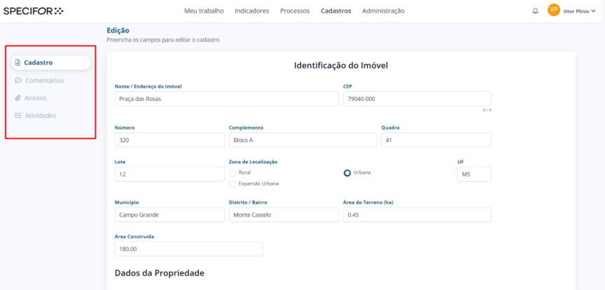 Este artigo detalha como editar e gerenciar um cadastro no Specifor, utilizando os submenus, abrangendo as informações do cadastro, comentários, anexos e atividades.
