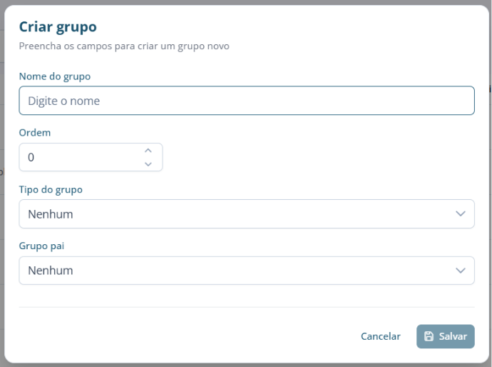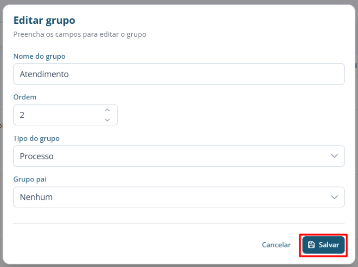 2. O formulário “Editar grupo” surgirá no centro da tela. Nele, é possível alterar informações como: Nome do grupo, Ordem, Tipo do grupo e Grupo pai do grupo. Ao finalizar as alterações, clique em “Salvar”.