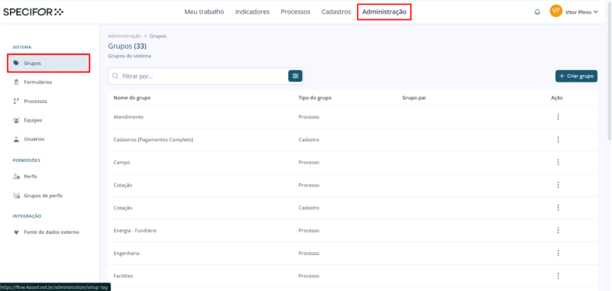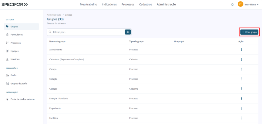 A gestão de grupos de processos e cadastros no Specifor permite organizar seus processos e informações de forma eficiente. Siga os passos abaixo para aprender como visualizar, criar, editar e excluir grupos de processos e cadastros na plataforma.