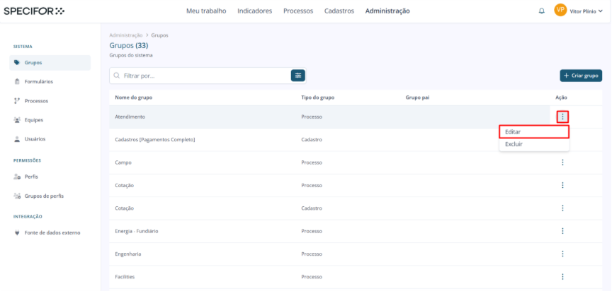 1. Para editar um grupo, clique nos três pontos na coluna “ação” do grupo e clique em "Editar".