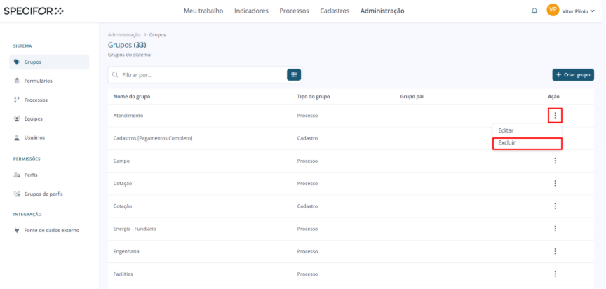 Para excluir um grupo, clique nos três pontos na coluna “ação” do grupo e clique em "Excluir". O sistema exibirá um aviso para que você confirme a ação de exclusão.
