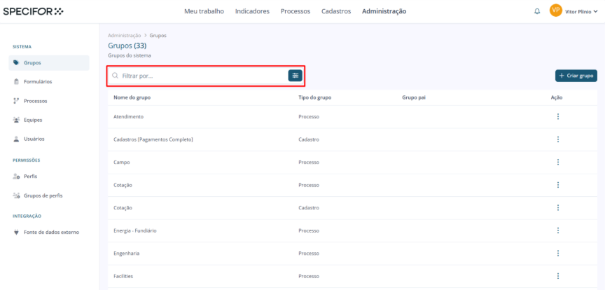Para filtrar um grupo pelo nome, utilize o campo “Filtrar por...” no início da tela.