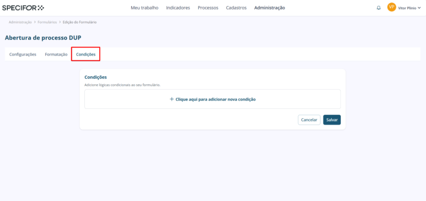 3. Clique no botão "+ Criar formulário", no canto direito da tela. A página de novo formulário será aberta, onde você iniciará a criação. Ela é composta por 3 etapas: Configurações, Formatação e Condições. Neste artigo, exploraremos a etapa de Condições do formulário.