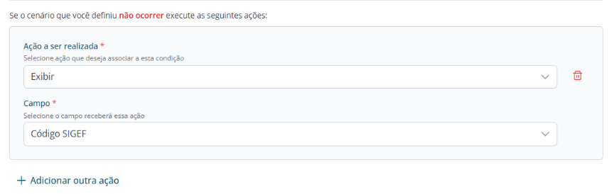 - Em "Ação a ser realizada" escolha a ação que será executada: Ocultar, Exibir, Desativar, Ativar, Exigir, Não exigir, Definir valor, Redefinir valor, Preencher, Calcular o valor do campo ou Concatenar campos.
