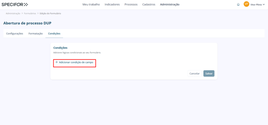 Para começar a configurar as condições, clique no botão "+ Clique aqui para adicionar nova condição" no centro da página de condições. Isso abrirá a interface para você definir a lógica. Em seguida, clique em “+ Adicionar condição de campo”.