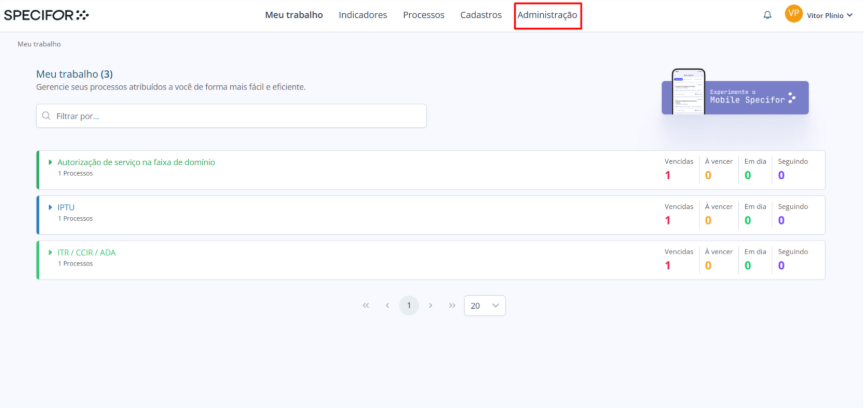 1. Na página principal do Specifor, clique em "Administração" no menu superior.
