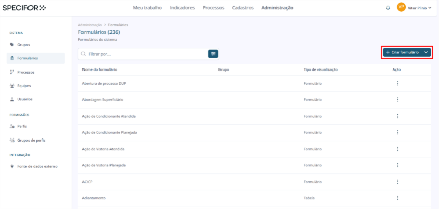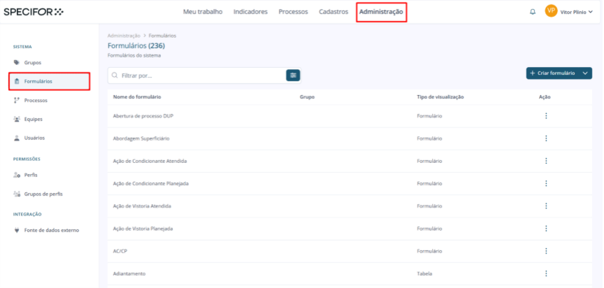 2. Em seguida, no menu localizado no canto direito da página de administração, clique em "Formulários", dentro da seção "Sistema".