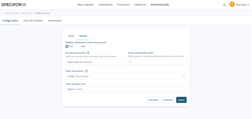Se deseja avançar entre as abas do processo, clique em “Próximo” ao final da página.