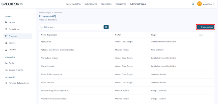 Para criar um processo, clique em “+ Criar processo” no canto direito da tela.