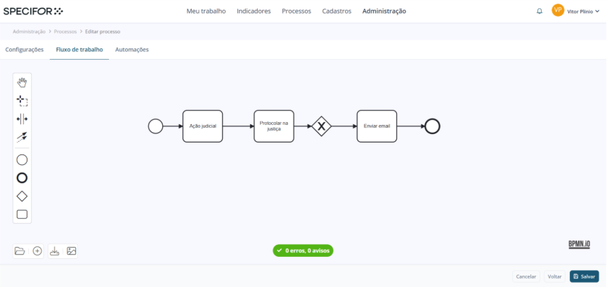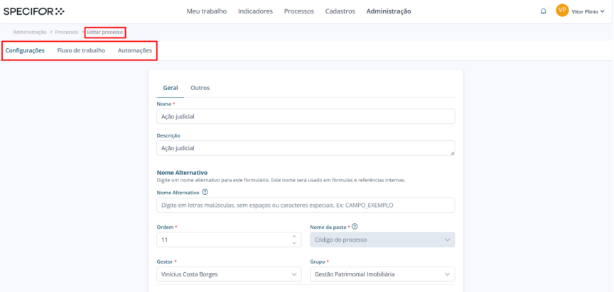A página de edição do processo será aberta. Nela, é possível navegar pelas 3 páginas de configurações do processo. São elas: