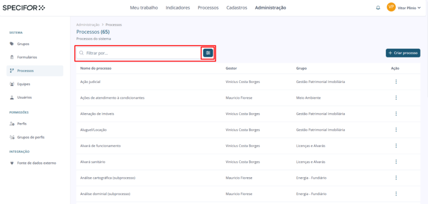 Para filtrar um processo pelo nome, utilize o campo “Filtrar por...” no início da tela. Se desejar filtrar o processo pelo Grupo, clique no botão azul ao final do campo.