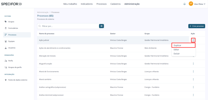 Para duplicar um processo, clique nos três pontos na coluna “ação” do processo e clique em "Duplicar".