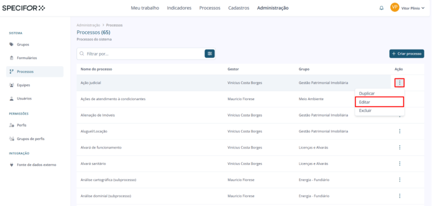 Para editar um processo, clique nos três pontos na coluna “ação” do processo e clique em "Editar".