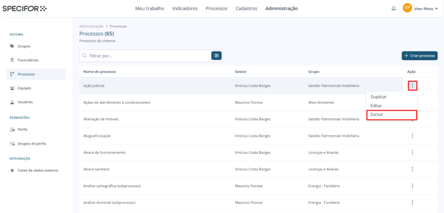 Para excluir um processo, clique nos três pontos na coluna “ação” do processo e clique em "Excluir". O sistema exibirá um aviso para que você confirme a ação de exclusão.