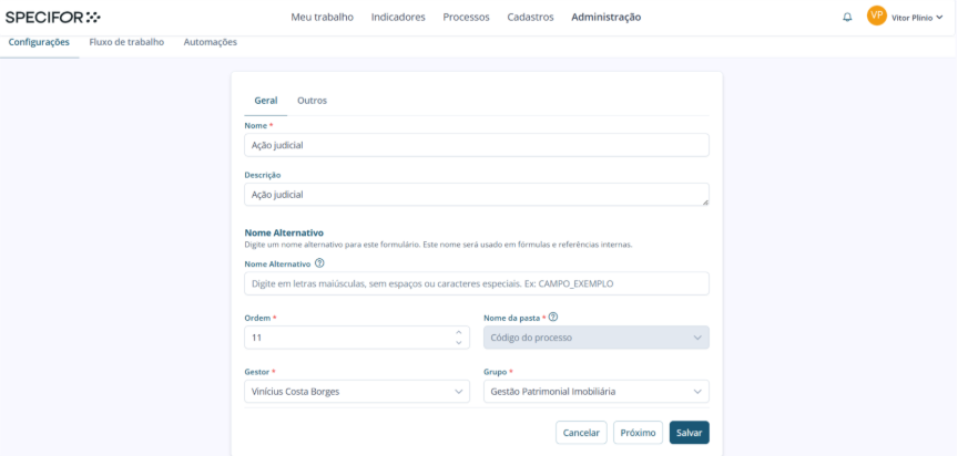 - Fluxo de trabalho: Alterar o fluxograma de etapas do processo.