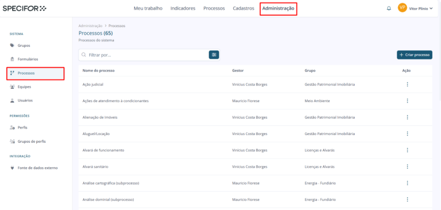 2. Na página de "Administração", no menu lateral localizado no canto esquerdo da página, dentro da seção "Sistema", clique em "Processos".