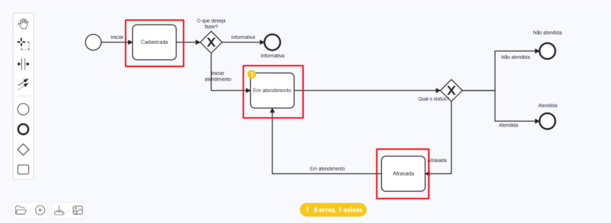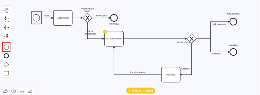 Abaixo das ferramentas de navegação e edição, há uma seção com ícones que representam os elementos fundamentais para construir um processo BPMN:
