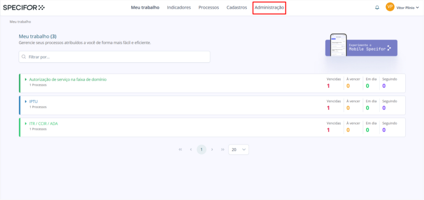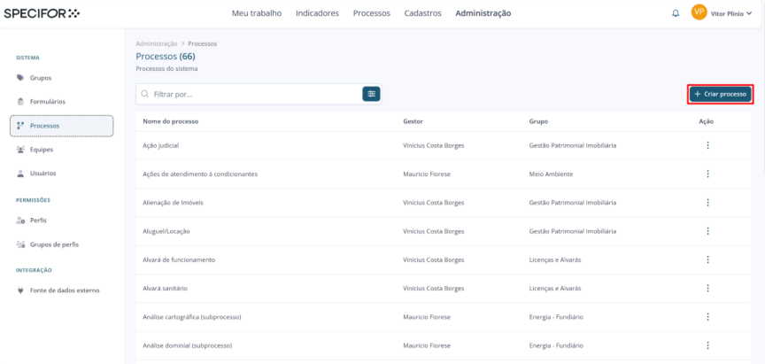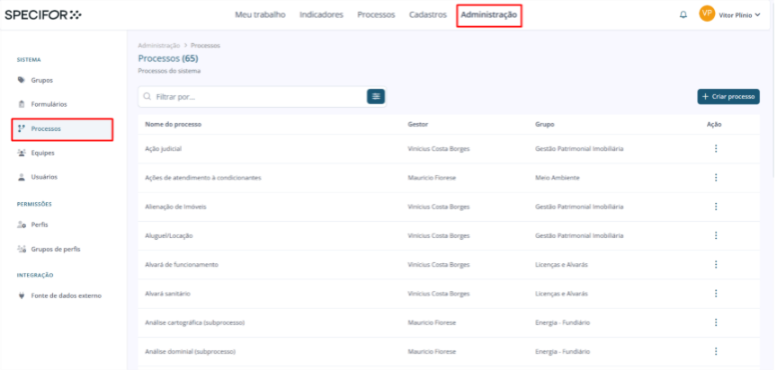 2. Na página de "Administração", no menu lateral localizado no canto esquerdo da página, dentro da seção "Sistema", clique em "Processos".