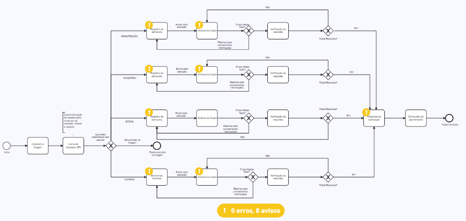 Esta seção permite que você defina a sequência de etapas, as transições e as ações que compõem o fluxo do seu processo. É aqui que você estrutura como o processo irá progredir, garantindo que cada fase seja executada de forma lógica e eficiente.