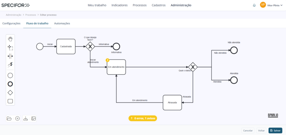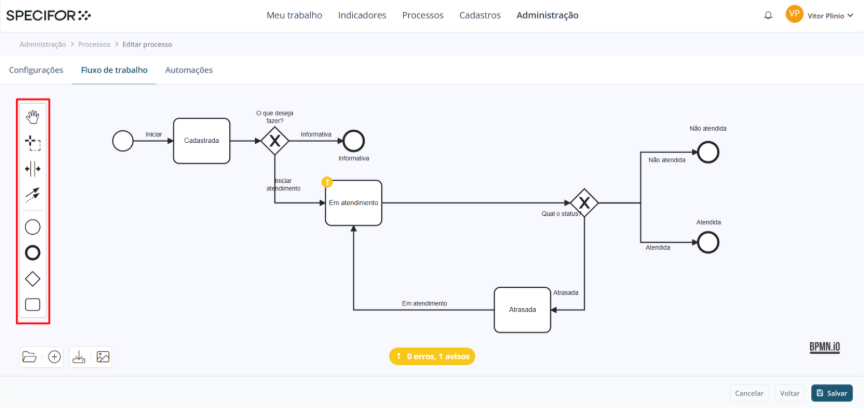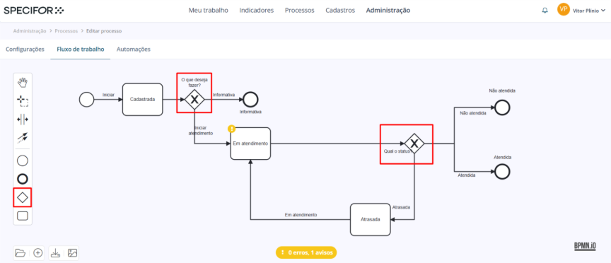 Para estruturar um fluxo de trabalho no Specifor, você seguirá os princípios do BPMN: