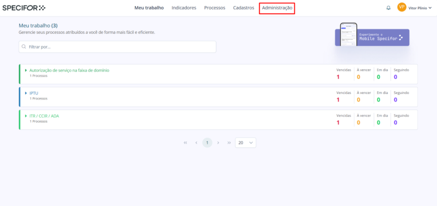 1. Na página inicial do Specifor, no menu superior, selecione "Administração".