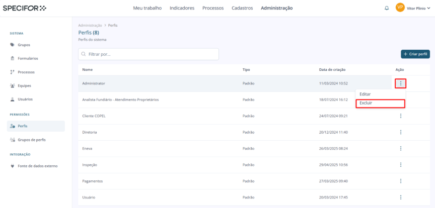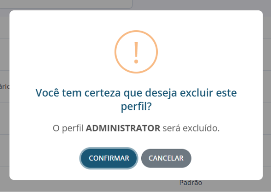 Para excluir um perfil, clique nos três pontos na coluna “ação” do perfil e clique em "Excluir". O sistema exibirá um aviso para que você confirme a ação de exclusão.