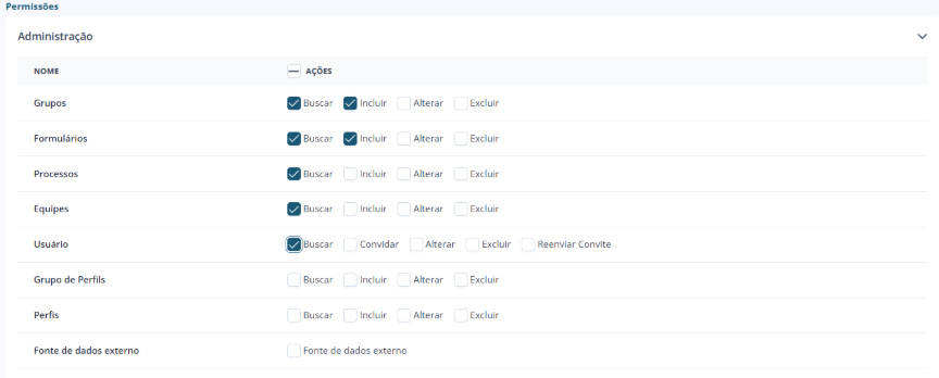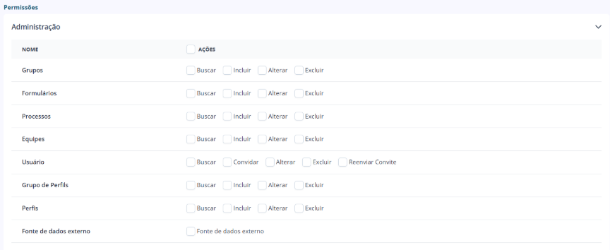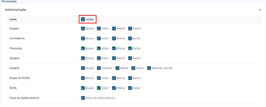 Para permitir acesso à todas as ações de um módulo, clique no seletor ao lado de “ações”. Dessa forma, todas as ações serão selecionadas, permitindo que os usuários do perfil tenham controle total naquele módulo.
