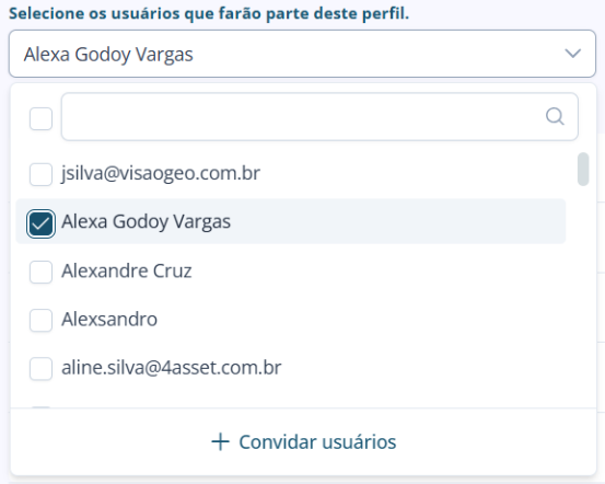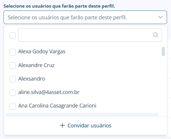 Para selecionar os usuários que farão parte do perfil, utilize o campo “Selecione os usuários que farão parte deste perfil.”. Ao clicar no campo, uma lista suspensa será exibida, contendo todos os usuários já cadastrados no Specifor.