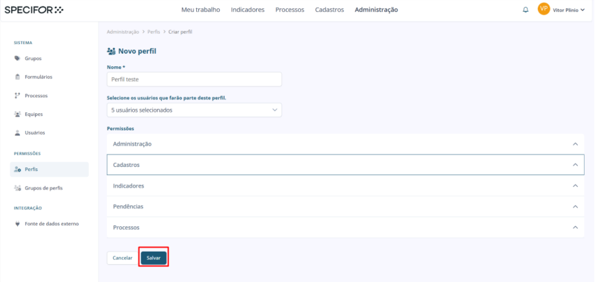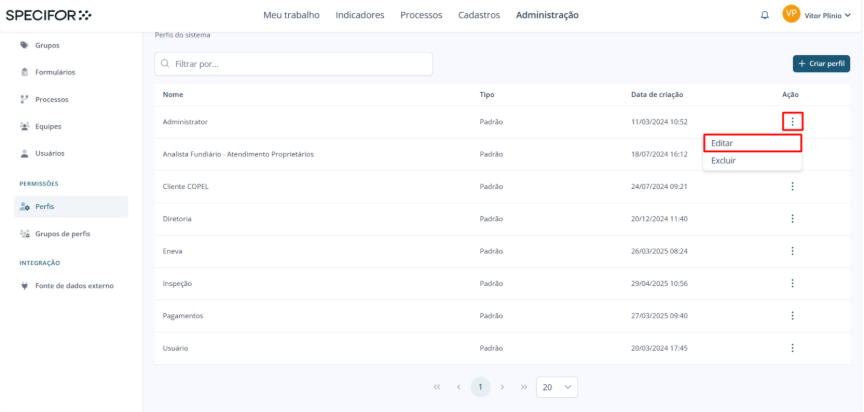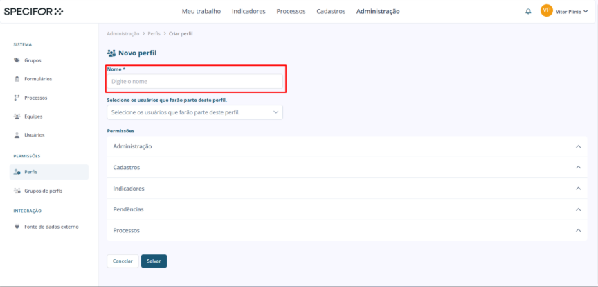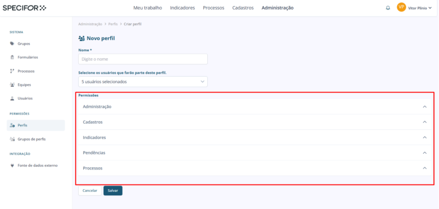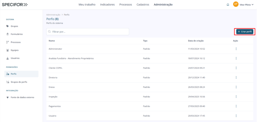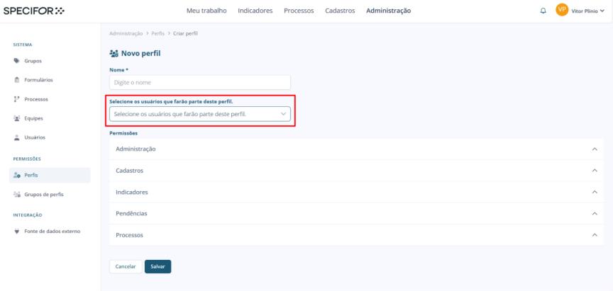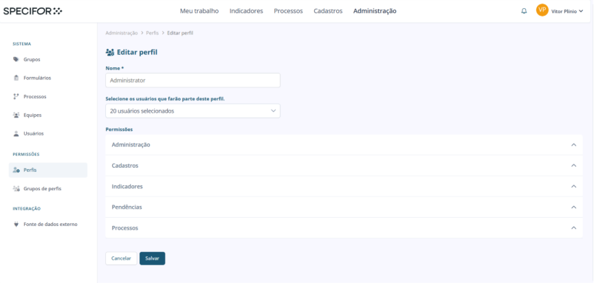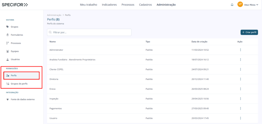 A gestão de perfis é crucial para garantir a segurança e a organização do acesso às funcionalidades do Specifor na sua empresa.