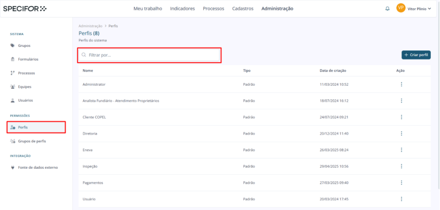 Para filtrar um perfil pelo nome, utilize o campo "Filtrar por", presente no início da aba “Perfis”.
