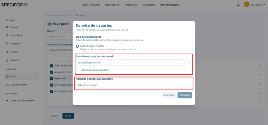 Um formulário surgirá na tela, permitindo que o administrador digite o e-mail do(s) novo(s) usuário(s). Além disso, é possível selecionar a equipe à qual o novo usuário fará parte.