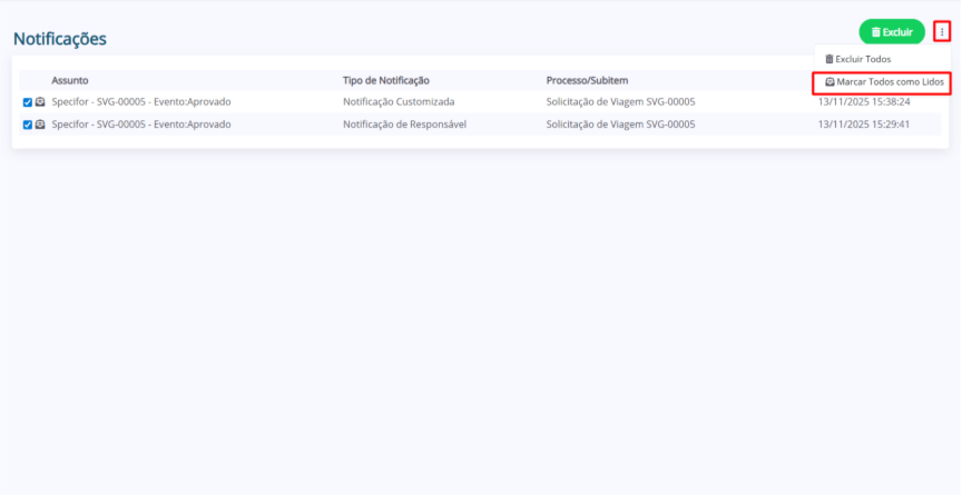 Para marcar todas as notificações como lidas, clique nos 3 pontos (menu de opções) ao lado do botão “Excluir” e selecione a opção “Marcar Todos Como Lidos” no menu suspenso.