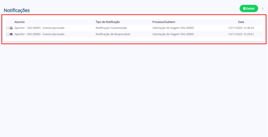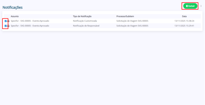 Para excluir uma ou mais notificações, marque a caixa de seleção ao lado das notificações que deseja remover e, em seguida, clique no botão “Excluir”.