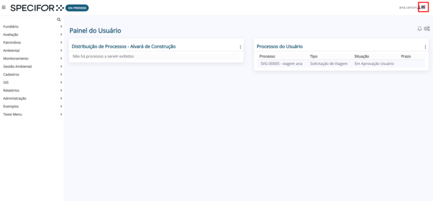 1. Na página inicial do Specifor, clique no ícone de envelope no canto superior direito da tela, ao lado do seu nome de usuário.