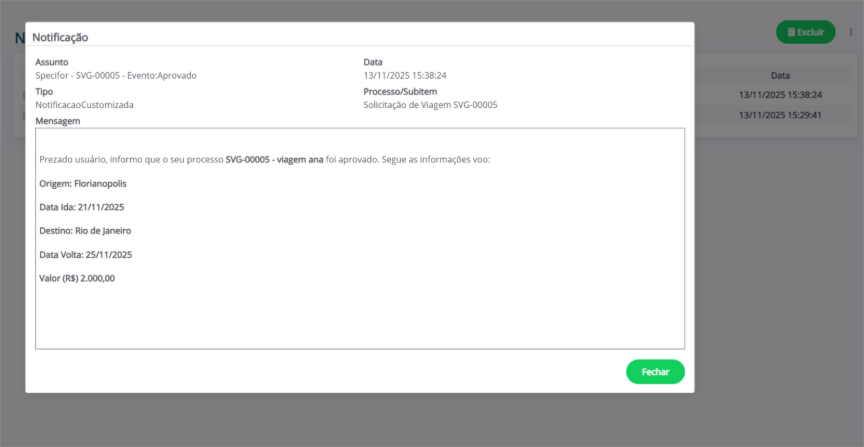 Para ver os detalhes de uma notificação, clique em seu assunto. Uma nova janela será aberta no centro da tela, mostrando: