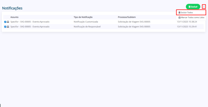 Para excluir todas as notificações de uma vez, clique nos 3 pontos (menu de opções) ao lado do botão “Excluir” e selecione a opção “Excluir Todos” no menu suspenso.