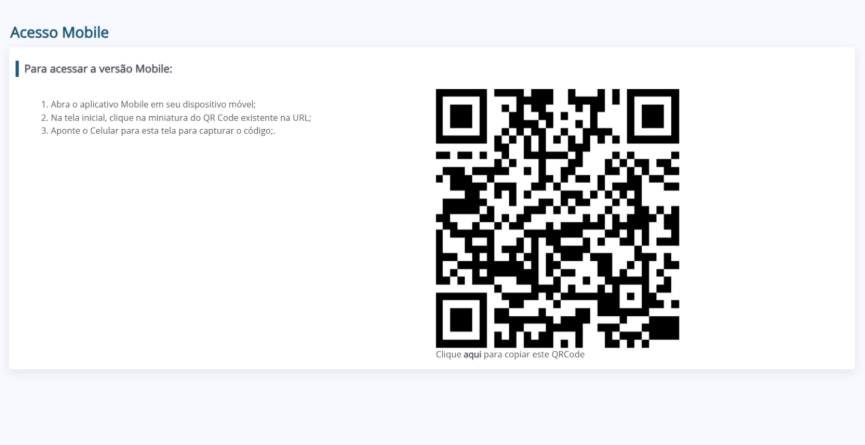 3. No segundo acesso à página “Acesso Mobile”, um QR Code será exibido na tela, junto com o passo a passo para utilizar a versão mobile.
