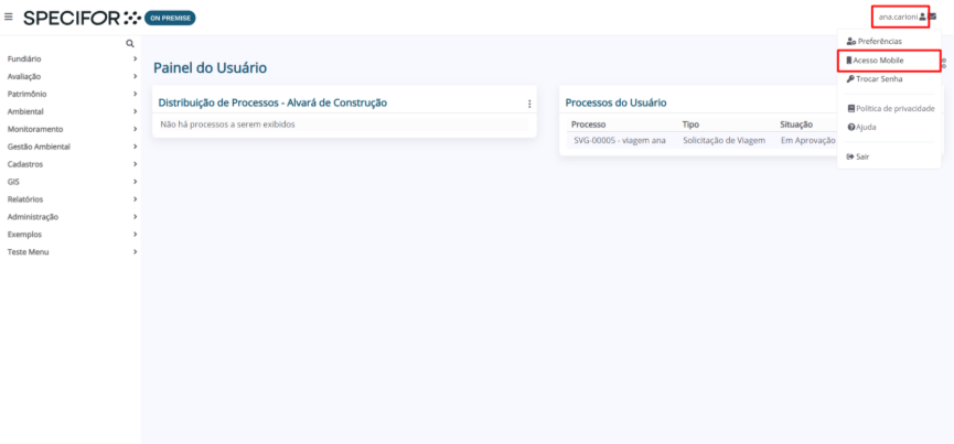 1. Na página inicial do Specifor, clique no seu nome do usuário no canto superior direito da tela. No menu suspenso, selecione “Acesso Mobile”.