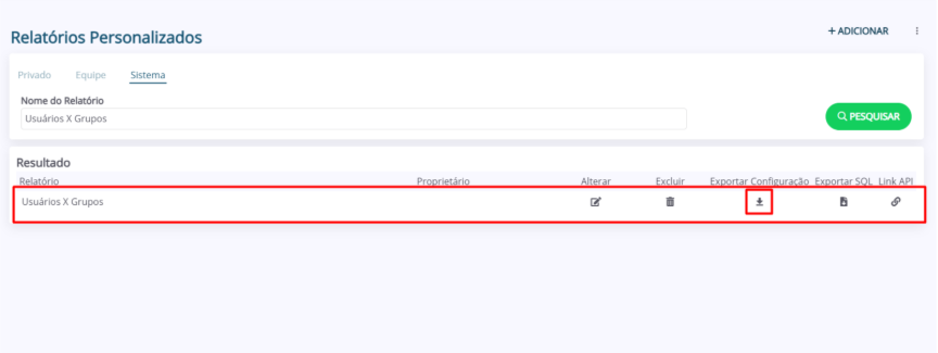 2. Na listagem “Resultado”, localize o relatório que deseja Exportar e clique no ícone da coluna “Exportar Configuração”.