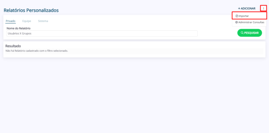 1. Na página “Relatórios Personalizados”, clique nos 3 pontos no canto superior direito. Em seguida, clique em “Importar”.