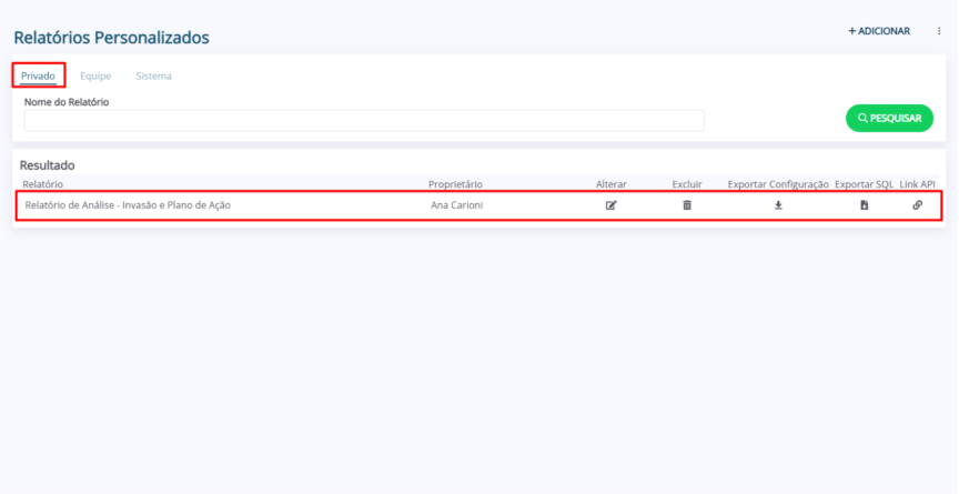 1. Na página “Relatórios Personalizados”, selecione o menu do relatório (Privado, Equipe, Sistema). Em seguida, utilizando o campo de filtragem “Nome do Relatório”, preencha o nome do relatório que deseja exportar e clique em “Pesquisar”.