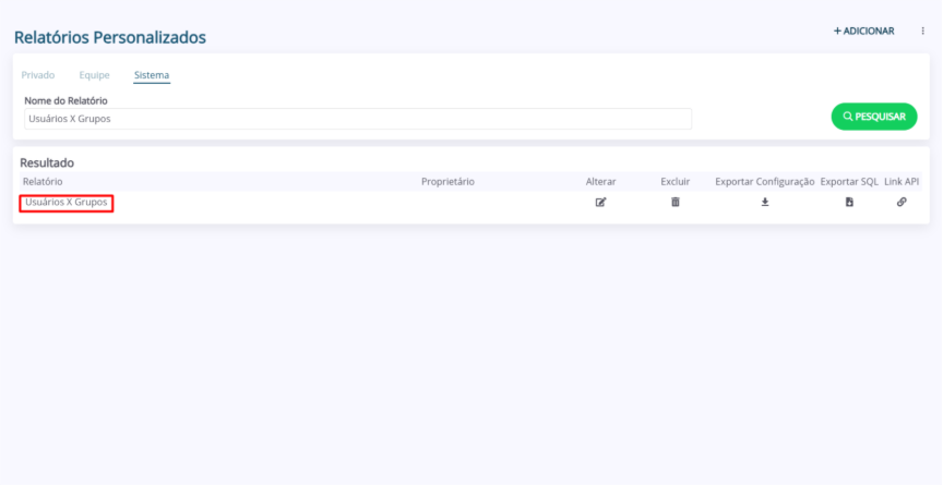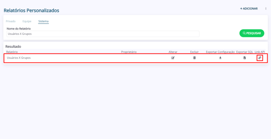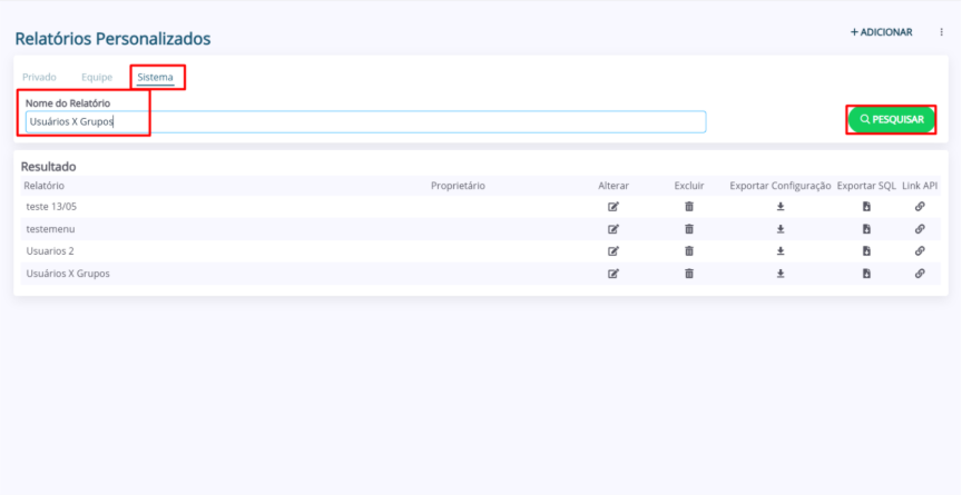 1. Na página “Relatórios Personalizados”, selecione o menu do relatório (Privado, Equipe, Sistema). Em seguida, utilizando o campo de filtragem “Nome do Relatório”, preencha o nome do relatório que deseja consultar o link de API e clique em “Pesquisar”.